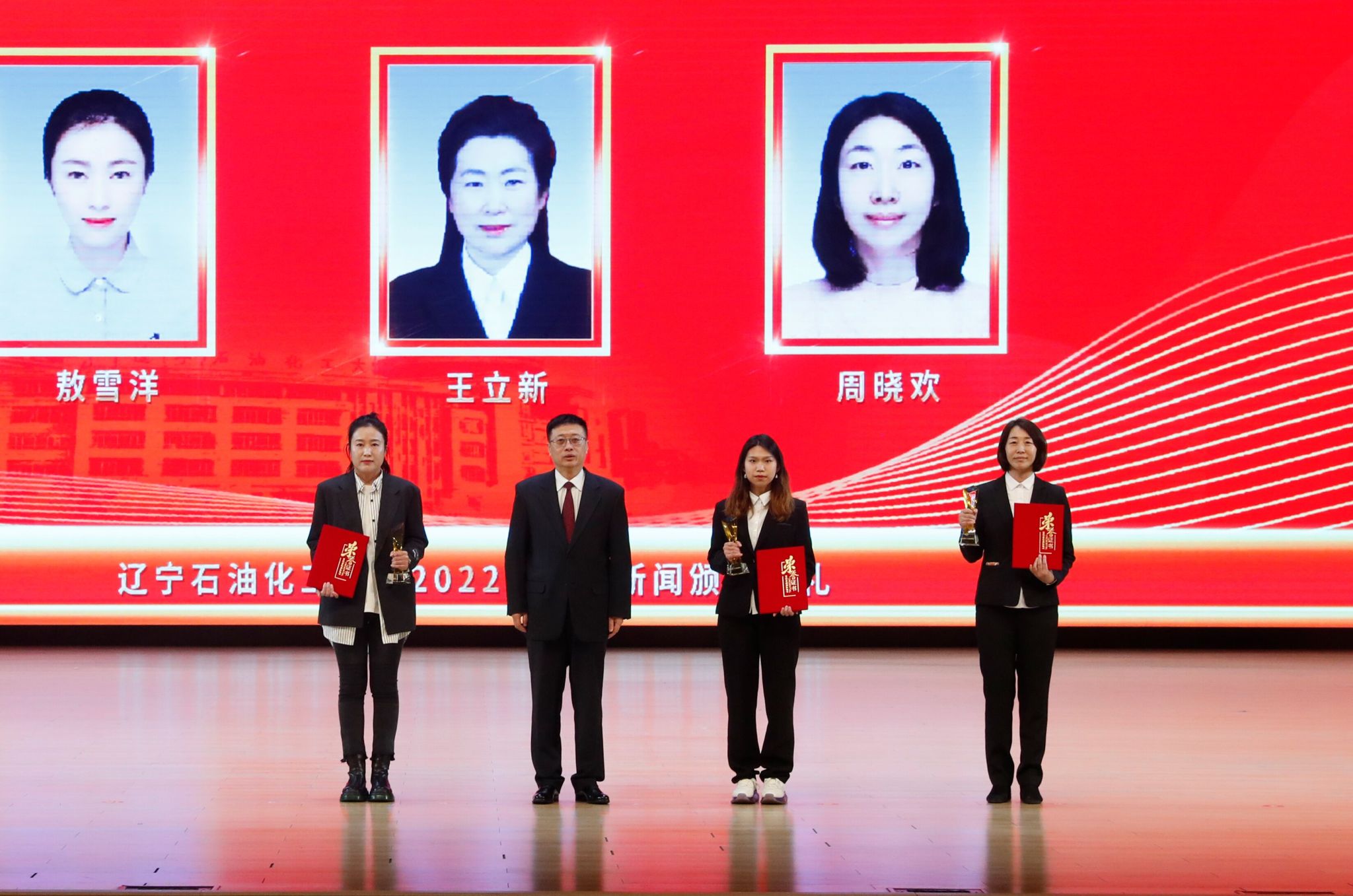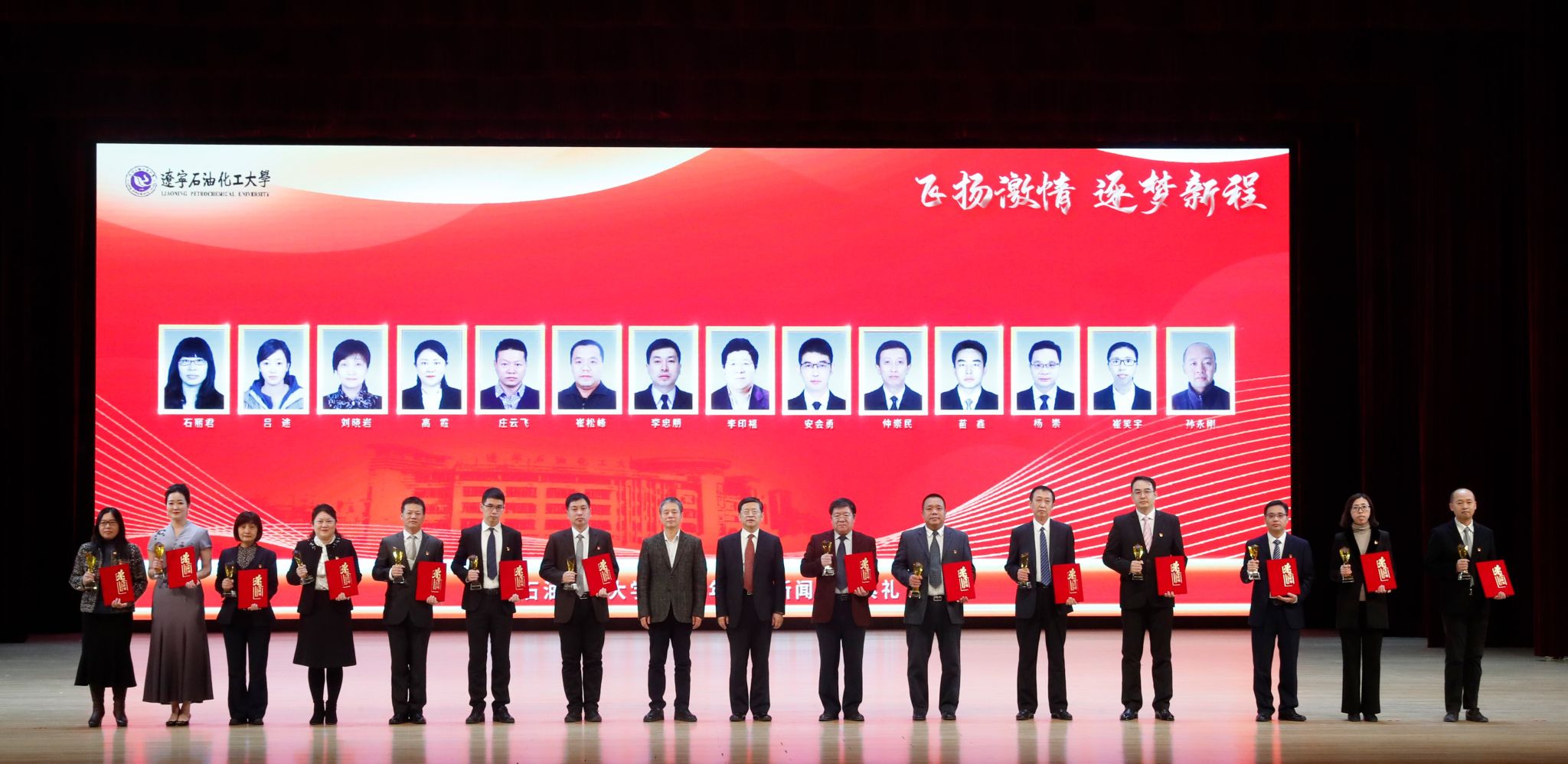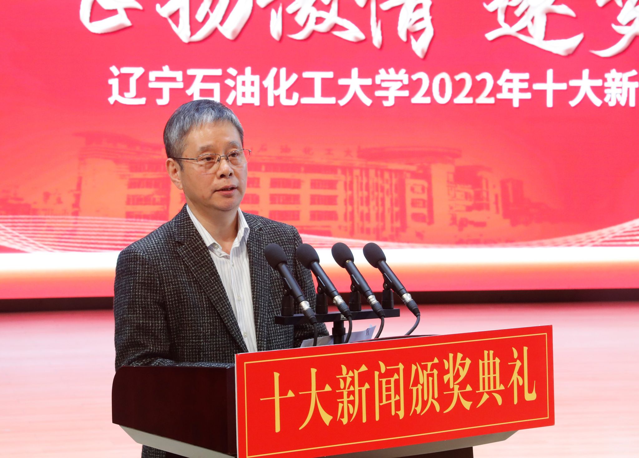 党委宣传部以学校2022年十大新闻为主线制作的宣传片为颁奖典礼开篇,深情回望辽石化大人写满汗水和收获的2022年。随后,专题片依次揭晓2022年度学校“十大新闻”。校领导登台为获奖者代表颁奖,以表彰和感谢他们为学校发展付出的艰辛努力、作出的突出贡献,勉励他们勇担新使命、奋进新征程。