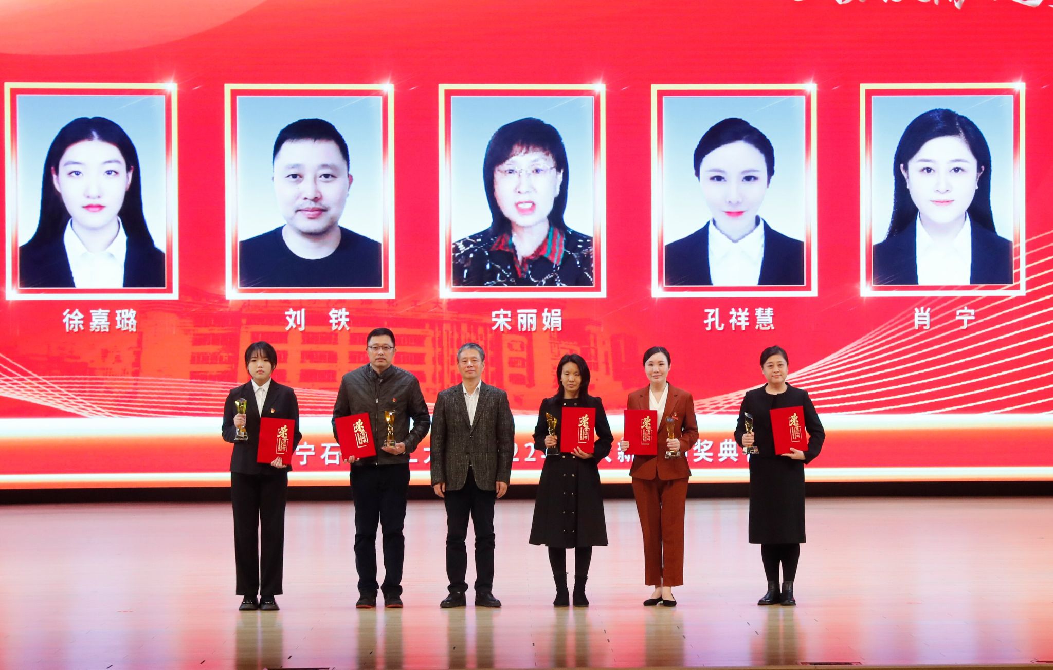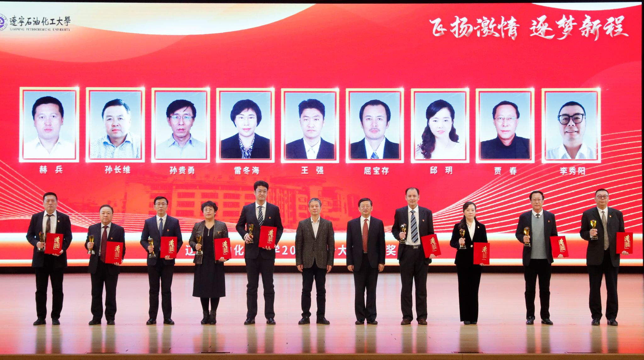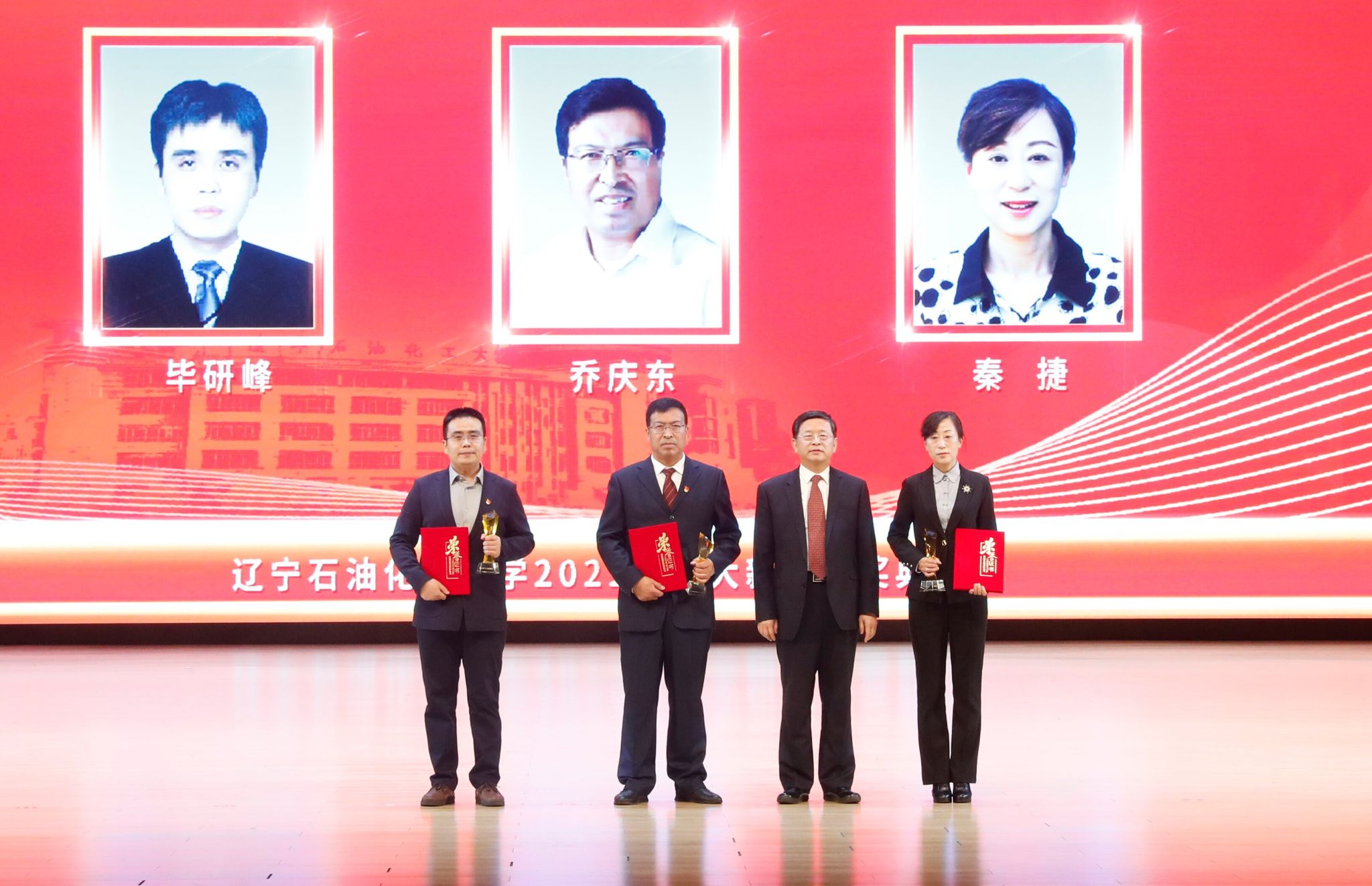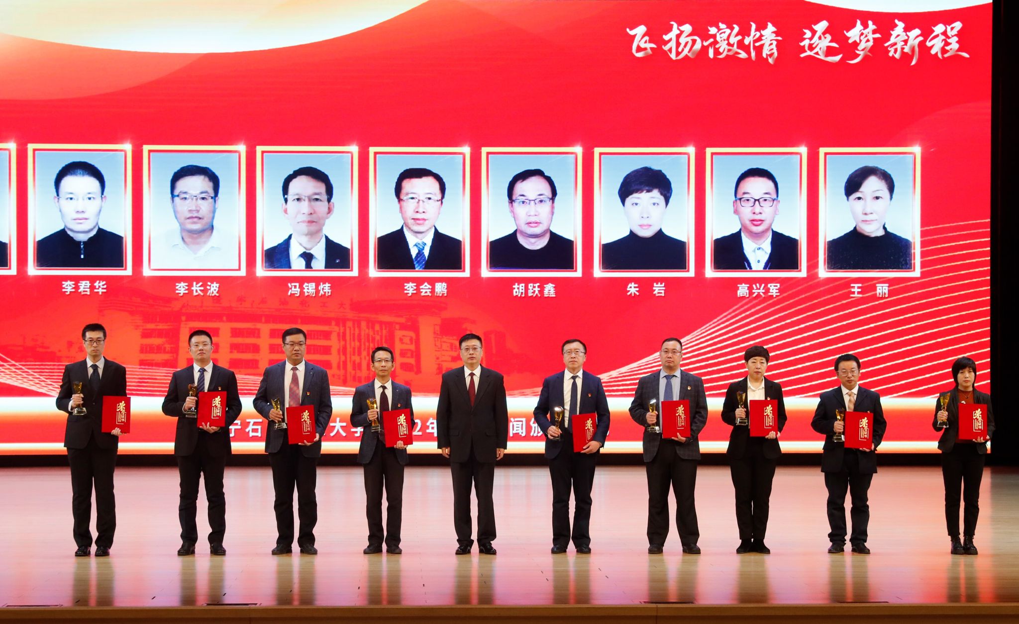 党委宣传部以学校2022年十大新闻为主线制作的宣传片为颁奖典礼开篇,深情回望辽石化大人写满汗水和收获的2022年。随后,专题片依次揭晓2022年度学校“十大新闻”。校领导登台为获奖者代表颁奖,以表彰和感谢他们为学校发展付出的艰辛努力、作出的突出贡献,勉励他们勇担新使命、奋进新征程。