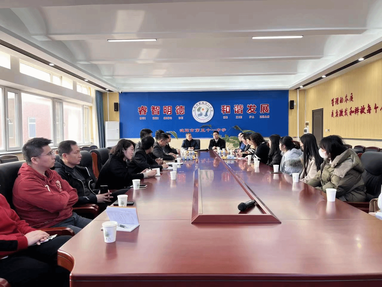 沈阳市第五十一中校长王国忠等接待了一行人员,双方在五十一中会议室开展了座谈交流。座谈会上,王国忠致欢迎词,从发展历史、办学理念、教学师资、特色校园文化及德育等方面详细介绍了高中各方面情况。当日正值该校召开高考百日誓师大会,王国忠由衷希望以此为契机,开启两校友好合作关系的崭新篇章。